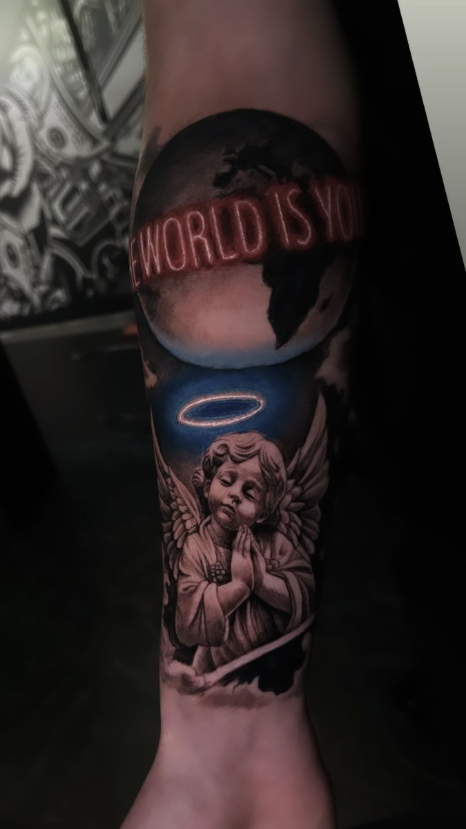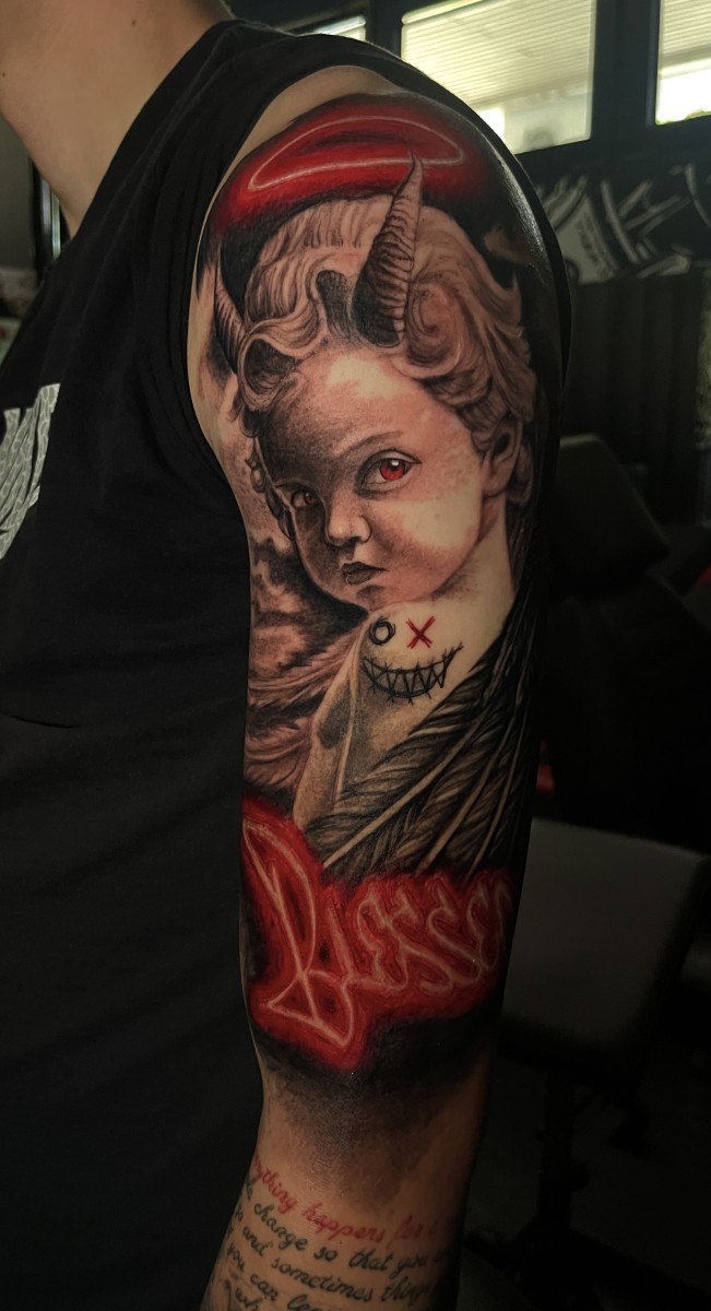 Based in Skopje, Milan Srbinoski is more than a tattoo artist, he’s a storyteller working across skin, canvas, stage, and voice. With nearly five years of professional tattooing experience, Milan brings a deeply personal, emotionally grounded style to every piece he creates. You’ll find him most days at Strumfovski Tattoo Studio, though his work has also taken him to Graz, Austria and Bruchsal, Germany for guest spots.